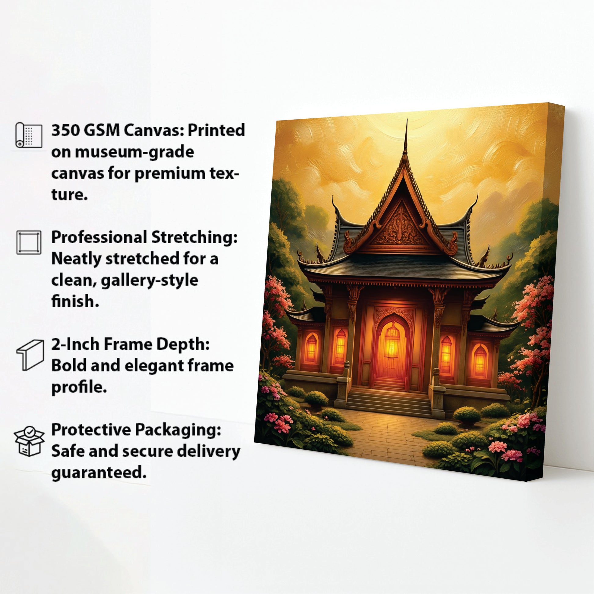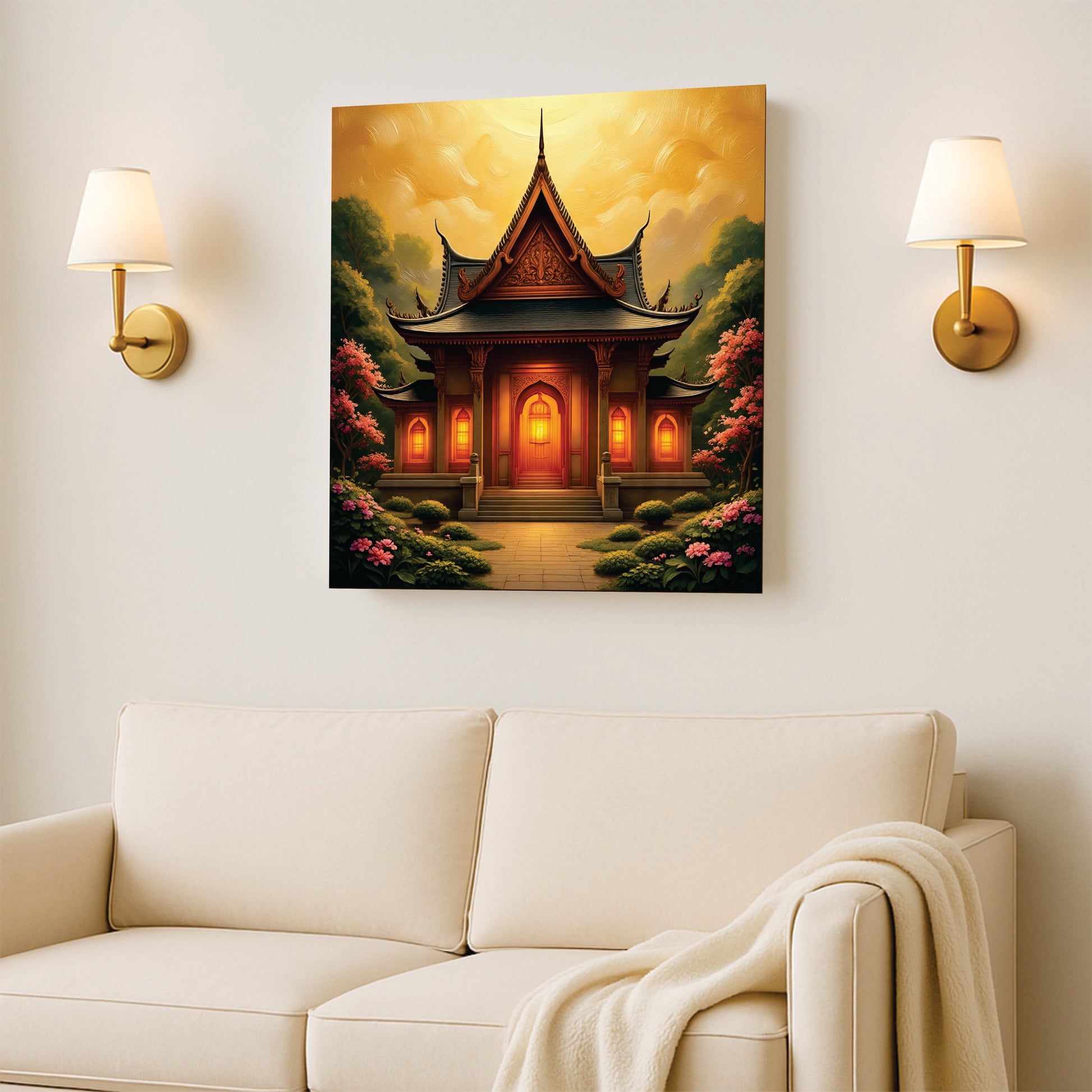 Golden Hour at the Temple Canvas Wall Art Painting expertly captures the serene beauty of twilight casting warm light over sacred architecture. Printed on high-quality canvas, this piece highlights intricate details and rich tones that evoke a tranquil, reflective atmosphere. Designed for longevity and visual impact, it is an excellent choice for those seeking to bring a refined cultural and spiritual ambiance into their interiors.