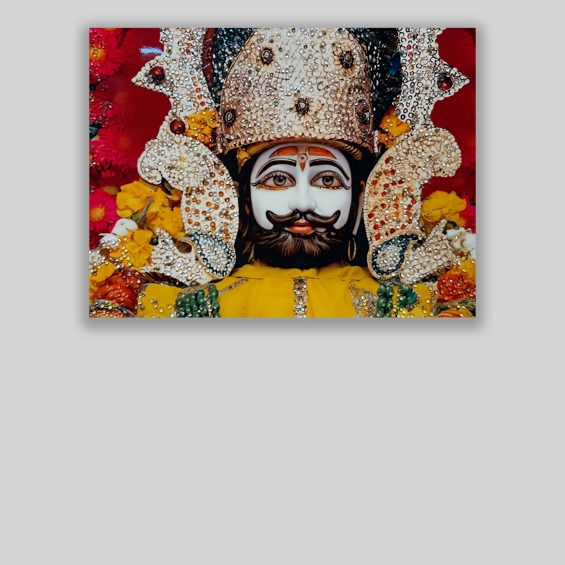 The Khatu Shyam Crystal Painting is a meticulously crafted artwork that captures the divine essence of Khatu Shyam Ji with sparkling crystal embellishments. This piece combines traditional devotion with contemporary artistry, making it a perfect addition to any sacred space. Its intricate detailing and radiant finish not only enhance spiritual ambiance but also serve as a lasting symbol of faith and reverence. Ideal for devotees seeking both aesthetic beauty and spiritual connection.